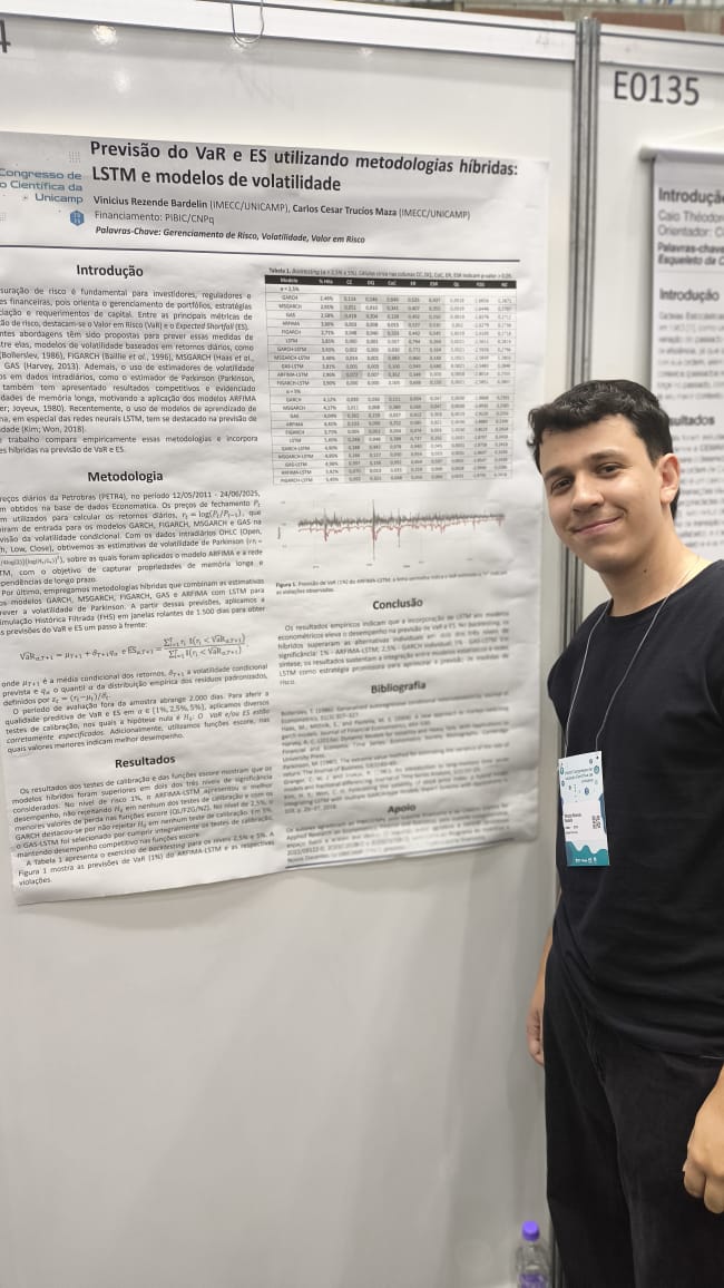 O Congresso de Iniciação Científica da UNICAMP reune bolsistas e voluntários que realizaram projetos de iniciação científica no último ano e promove um espaço para discussão e divulgação científica. Nesta oportunidade, quatro trabalhos de alunos do CAREFS foram apresentados: Detecção de outliers em modelos de fatores dinâmicos (Cauã), Introdução a equações diferenciaisestocásticas e precificação de derivativos através de simulação (Guilherme), Modelos de aprendizado de máquina não supervisionado aplicados na construção de portfólios de investimentos (Richard) e Previsão do VaR e ES utilizando metodologias híbridas: LSTM e modelos de volatilidade (Vinicius).