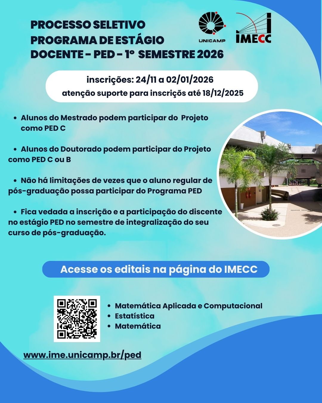As inscrições para participação no Programa de Estágio Docente (PED), no 1º semestre de 2026, serão realizadas durante o período de 24 de novembro de 2025 a 02 de janeiro de 2026 pelo sistema e-dac https://sistemas.dac.unicamp.br/siga/mobile/signin.