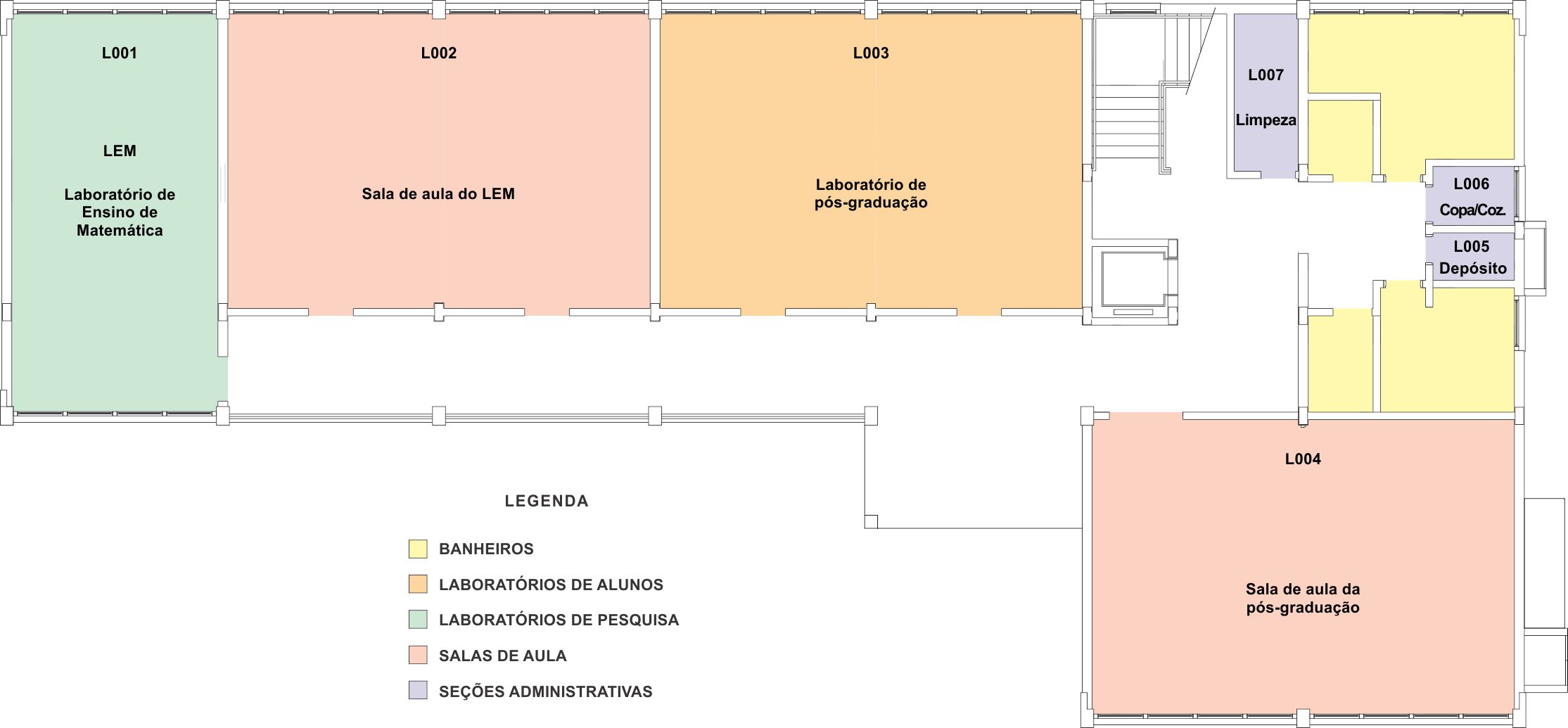 O térreo do Anexo II abriga o LEM - Laboratório de Ensino de Matemática, duas salas de aula e um laboratório computacional.