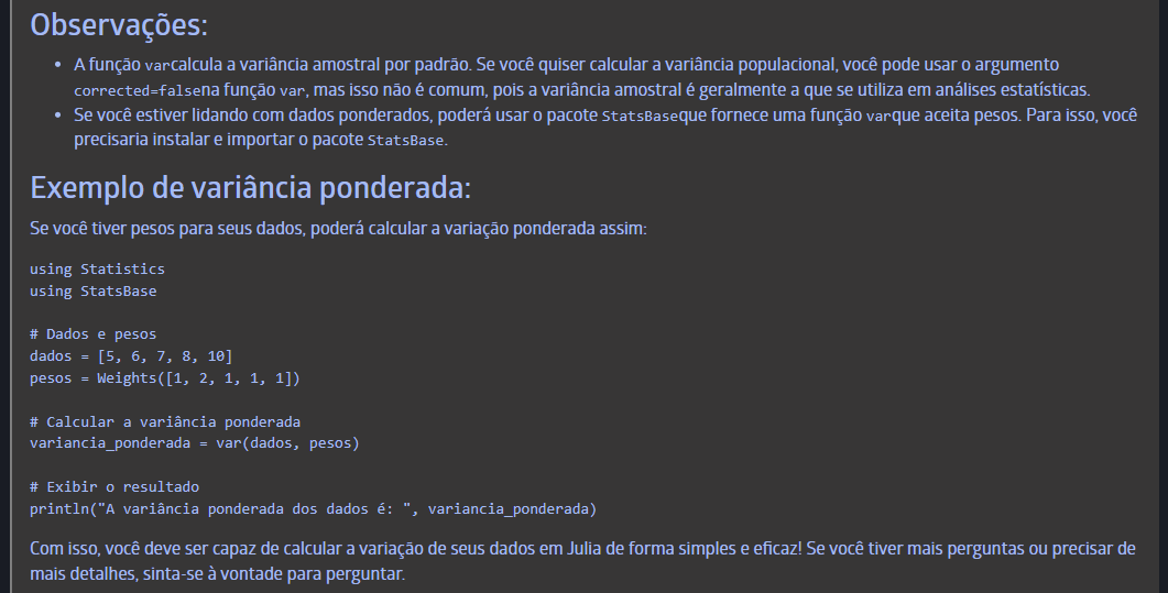De forma rápida e eficiente, a IA retorna instruções claras e exemplificadas sobre o que foi perguntado, além de incluir extensões consideradas relevantes pelo sistema que a opera. No teste apresentado acima, além de responder diretamente à questão sobre a variância clássica, a IA também trouxe informações complementares sobre a variância ponderada, os pacotes necessários para usar as funções mencionadas, como criar o vetor de dados na linguagem Julia e como exibir a saída de forma personalizada.